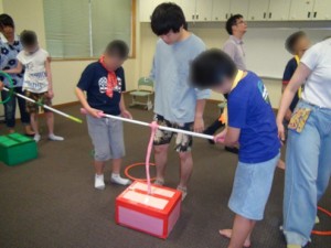 2人で棒を持ちゴールまで大きなパズルのピースを運ぶ活動です。 ペアの友逹と高さや動き、ペースを合わせて運ぶことを目的としています。 パズル好きなお子さんが多いため、パズルを使った活動を取り入れました。